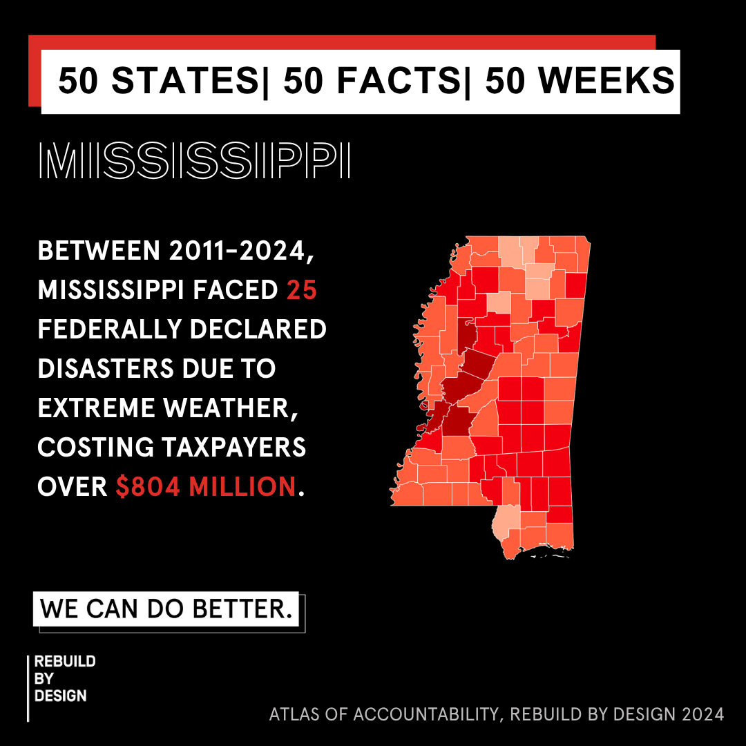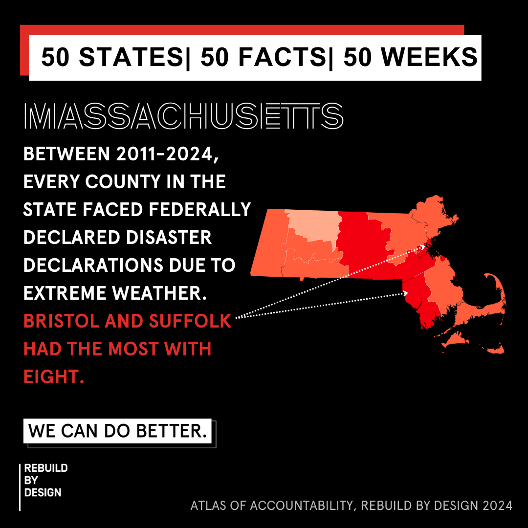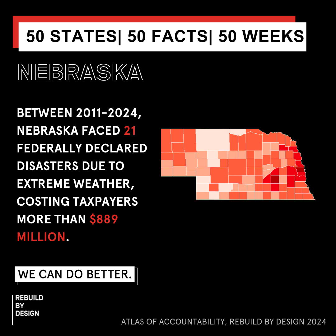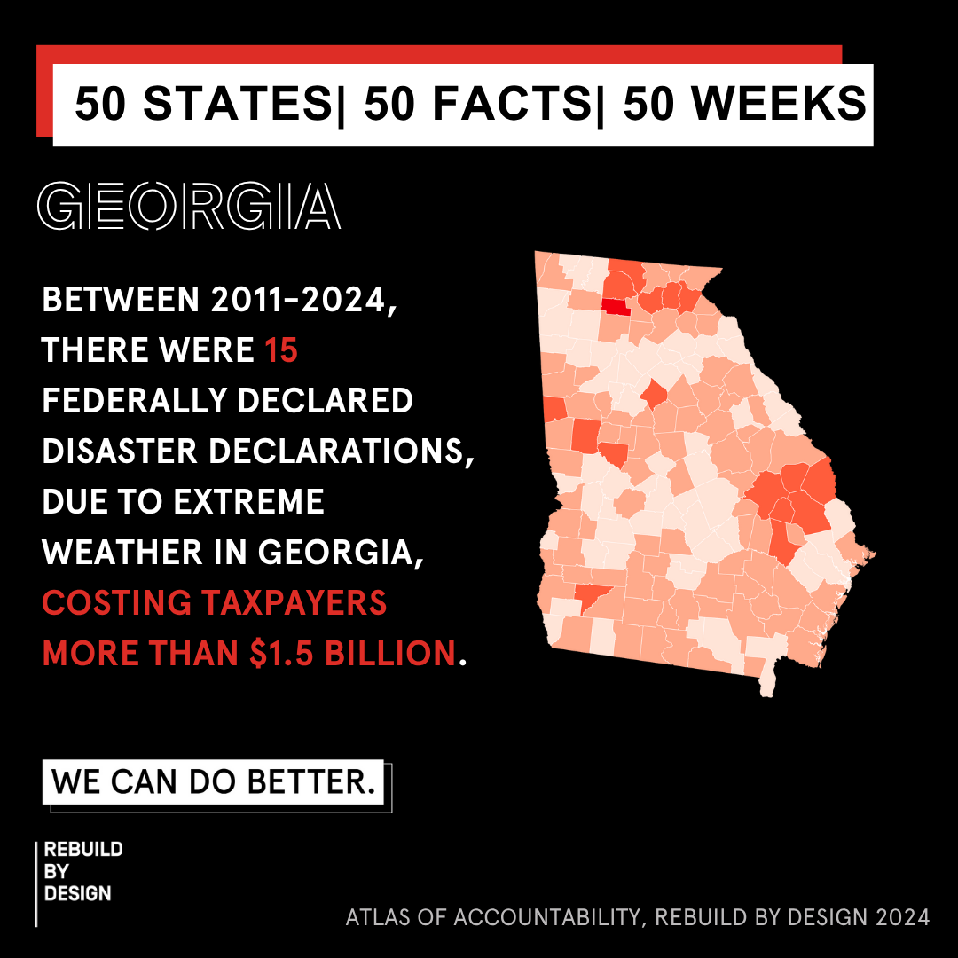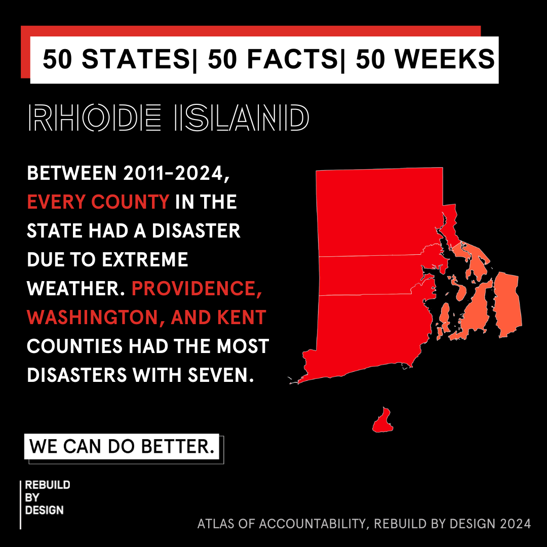 In 2024, Rebuild by Design launched the 50 States | 50 Facts | 50 Weeks social media campaign to bring national attention to the true scope of climate impacts in the United States. Each week, we shared data-driven graphics highlighting how every state has been affected by federally declared disasters—ranging from hurricanes to wildfires to extreme heat—and the billions in recovery costs paid by taxpayers.