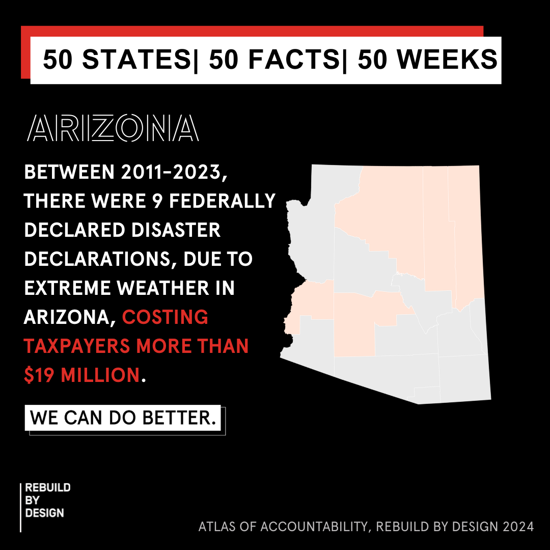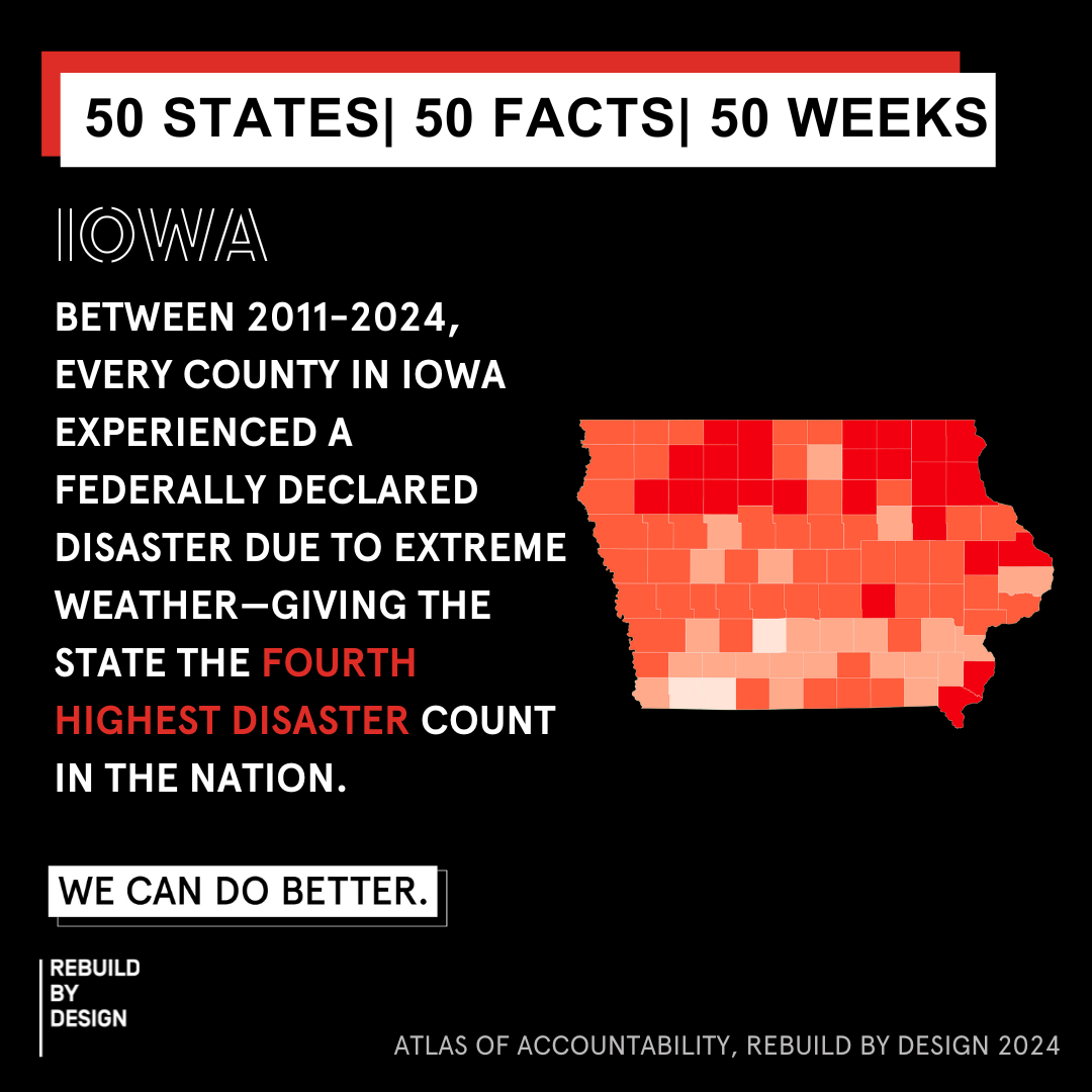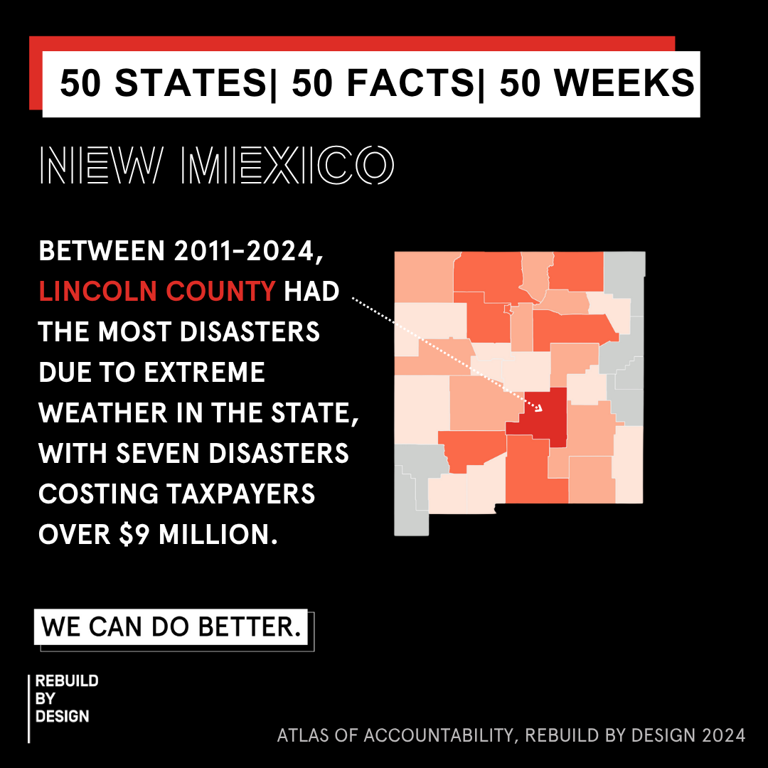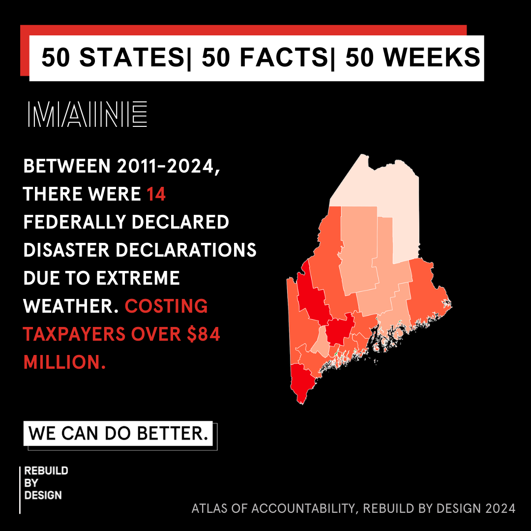 In 2024, Rebuild by Design launched the 50 States | 50 Facts | 50 Weeks social media campaign to bring national attention to the true scope of climate impacts in the United States. Each week, we shared data-driven graphics highlighting how every state has been affected by federally declared disasters—ranging from hurricanes to wildfires to extreme heat—and the billions in recovery costs paid by taxpayers.