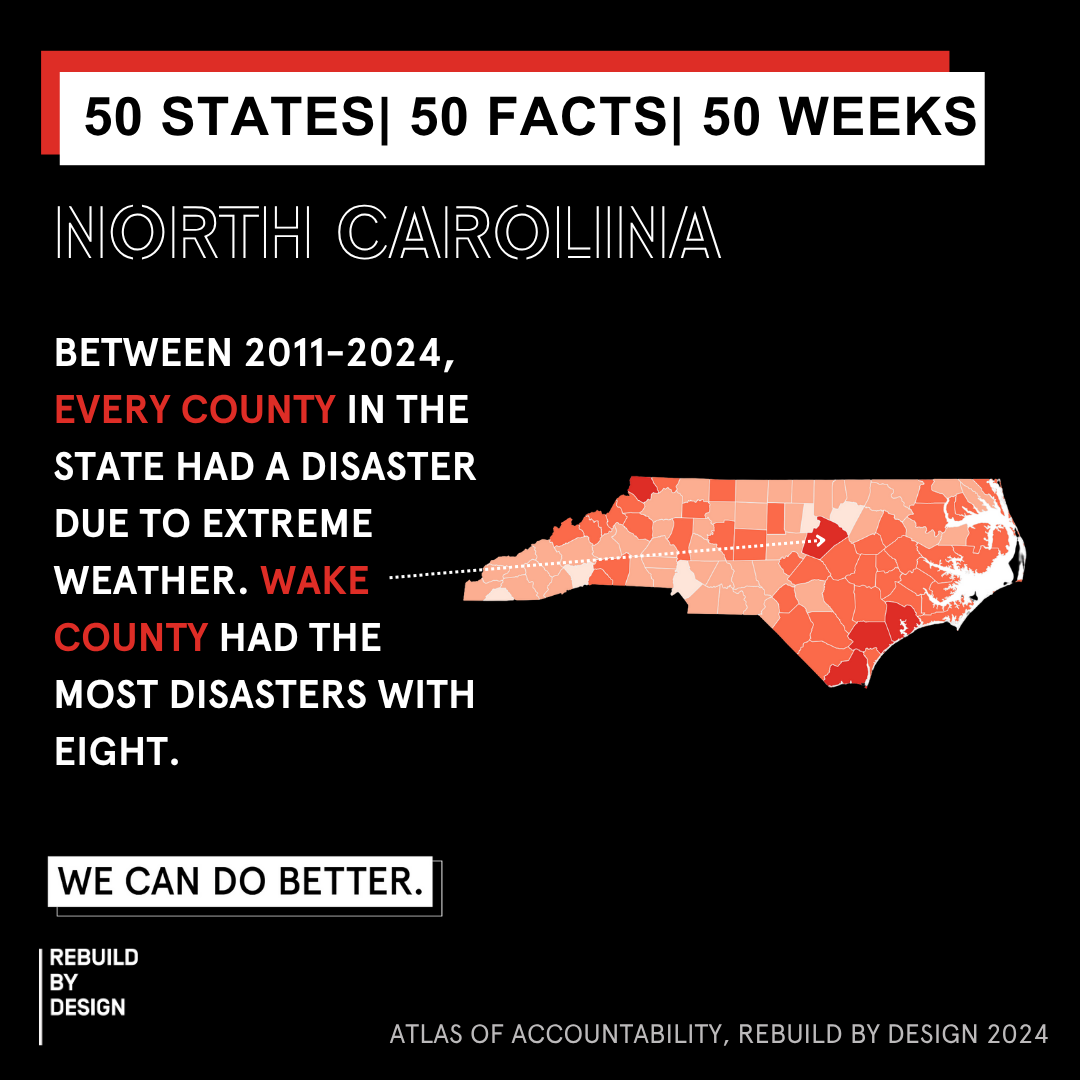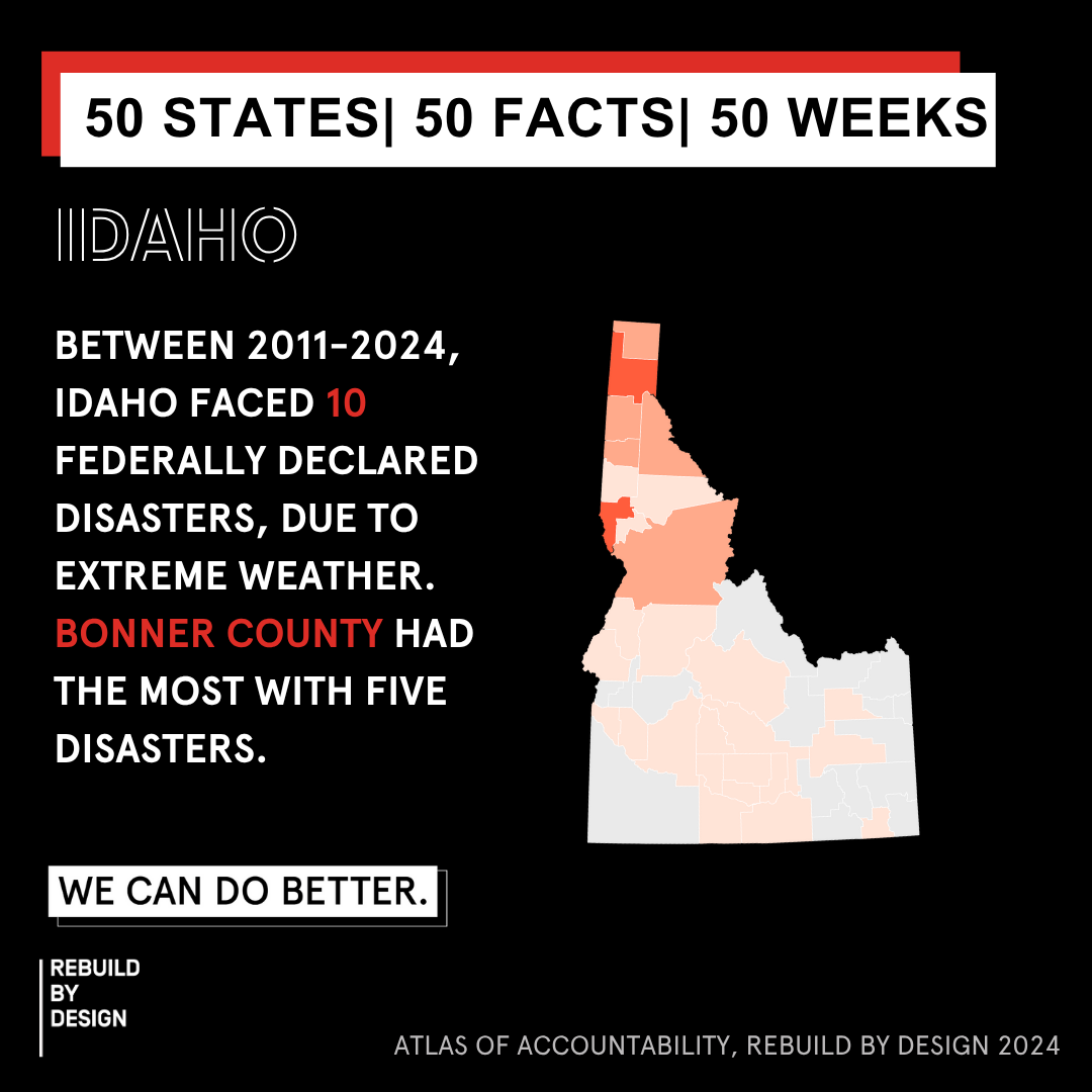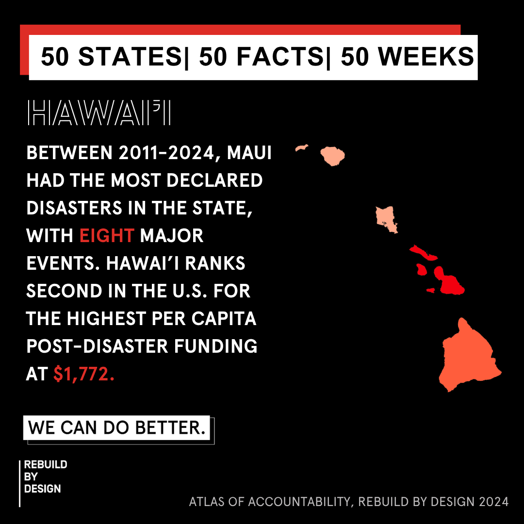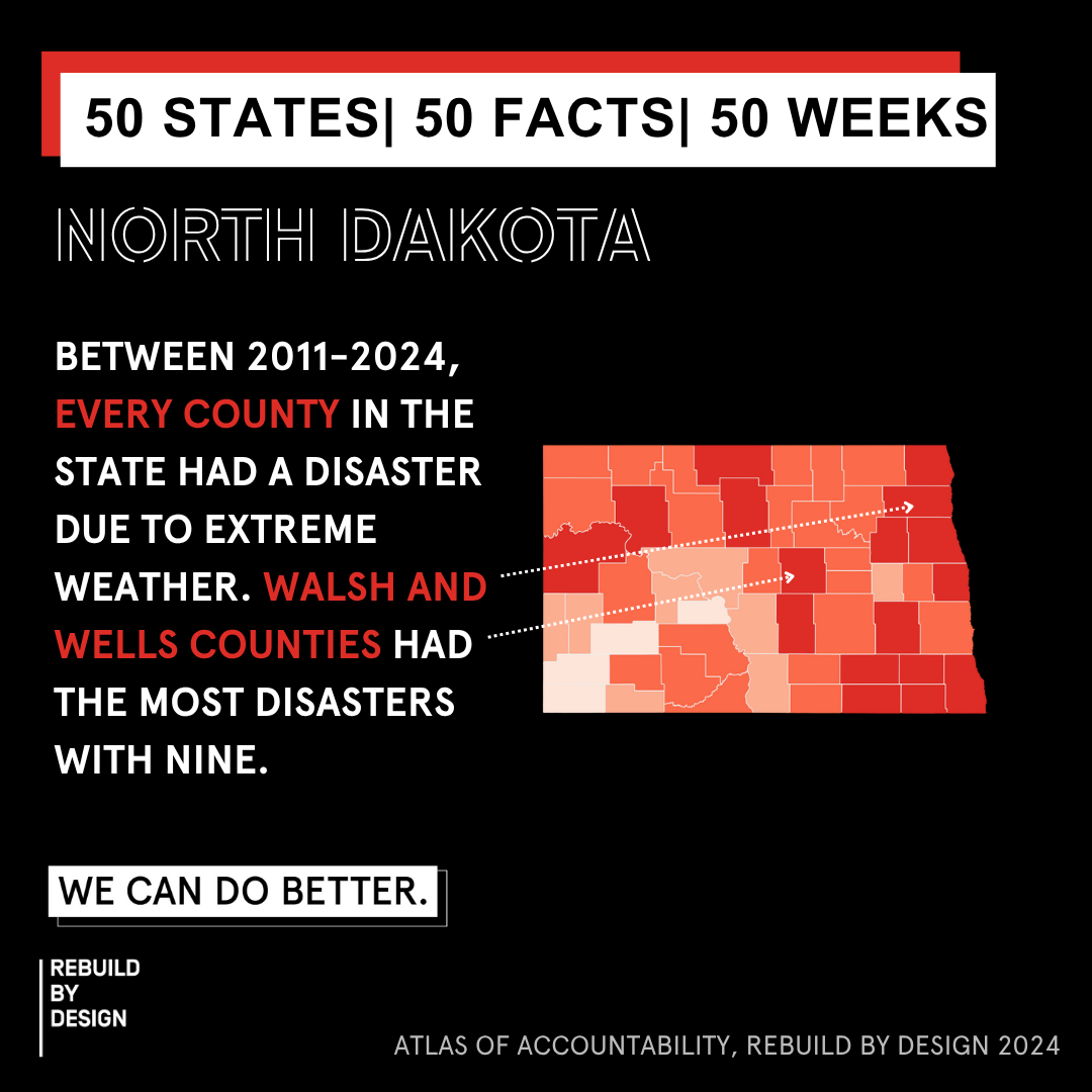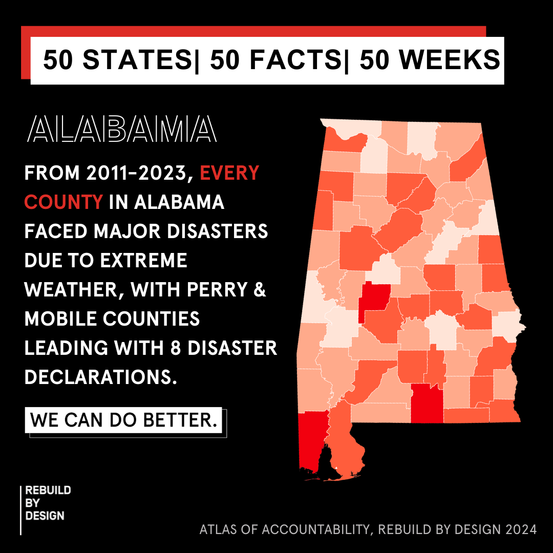 In 2024, Rebuild by Design launched the 50 States | 50 Facts | 50 Weeks social media campaign to bring national attention to the true scope of climate impacts in the United States. Each week, we shared data-driven graphics highlighting how every state has been affected by federally declared disasters—ranging from hurricanes to wildfires to extreme heat—and the billions in recovery costs paid by taxpayers.