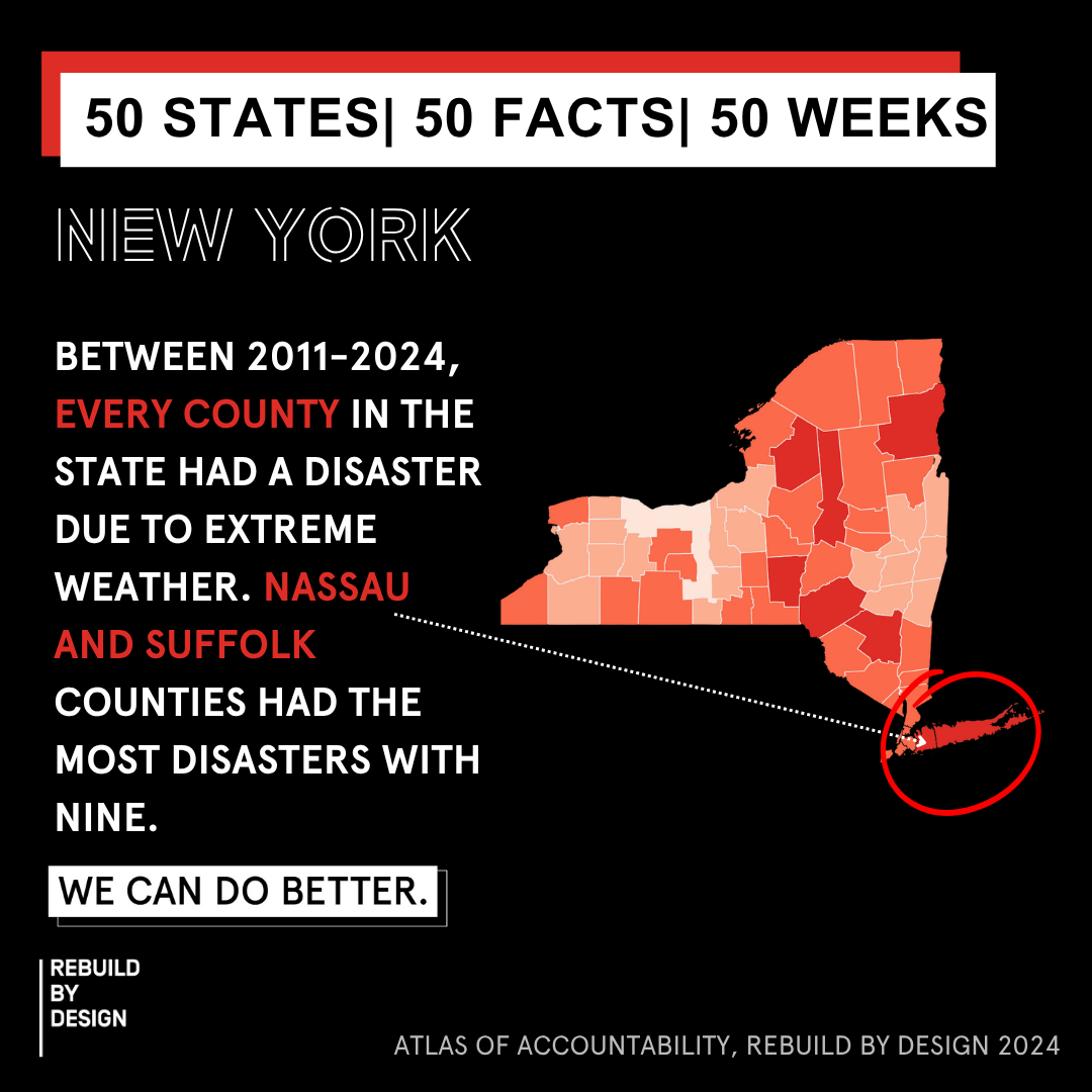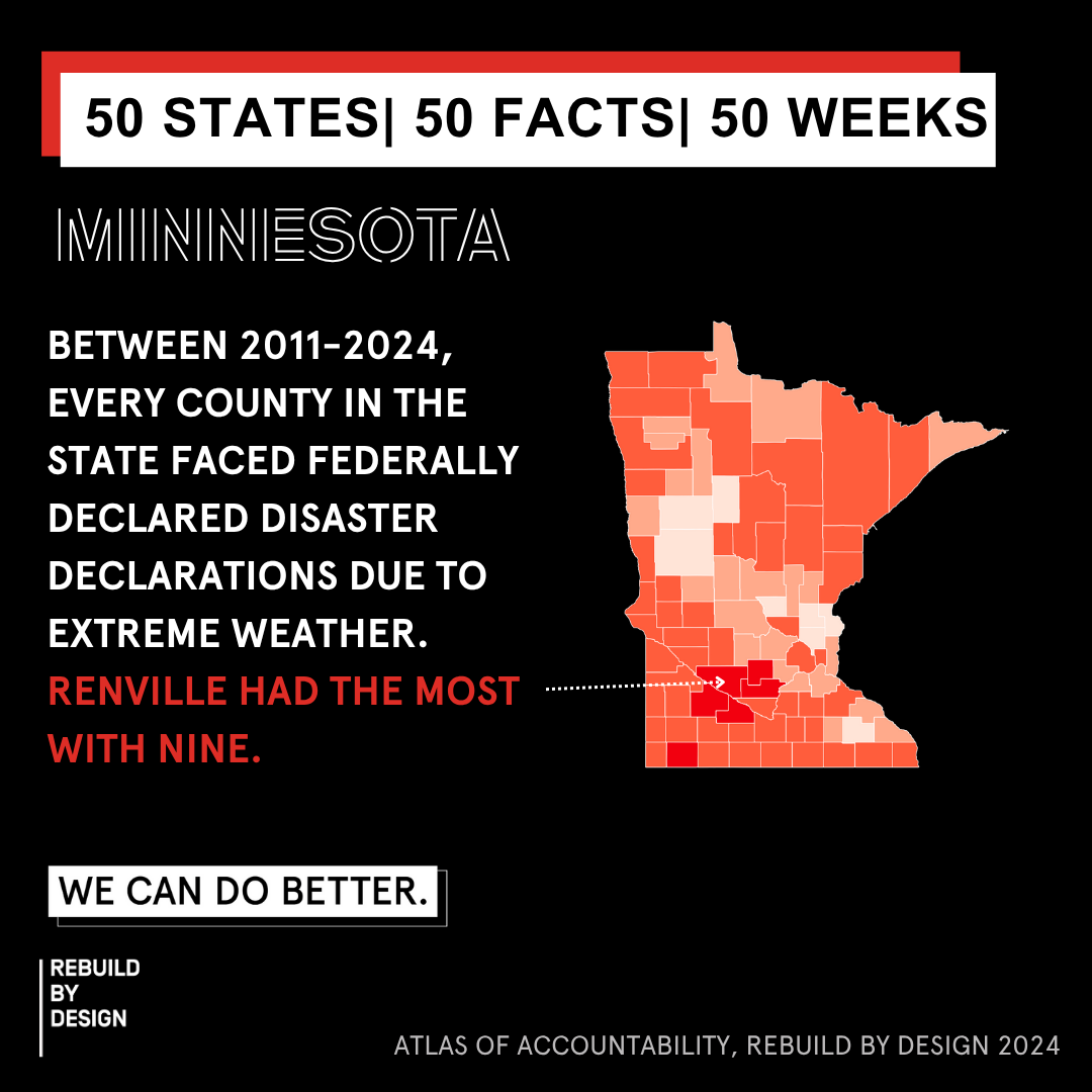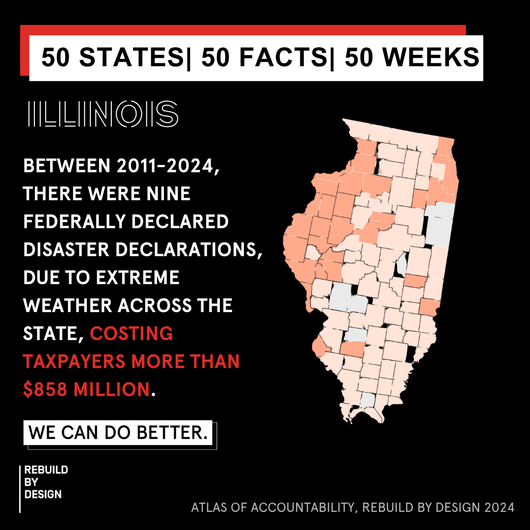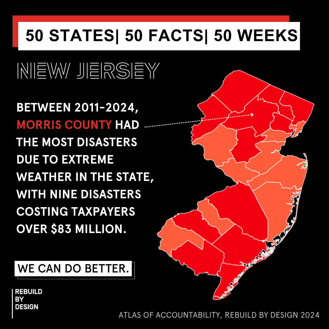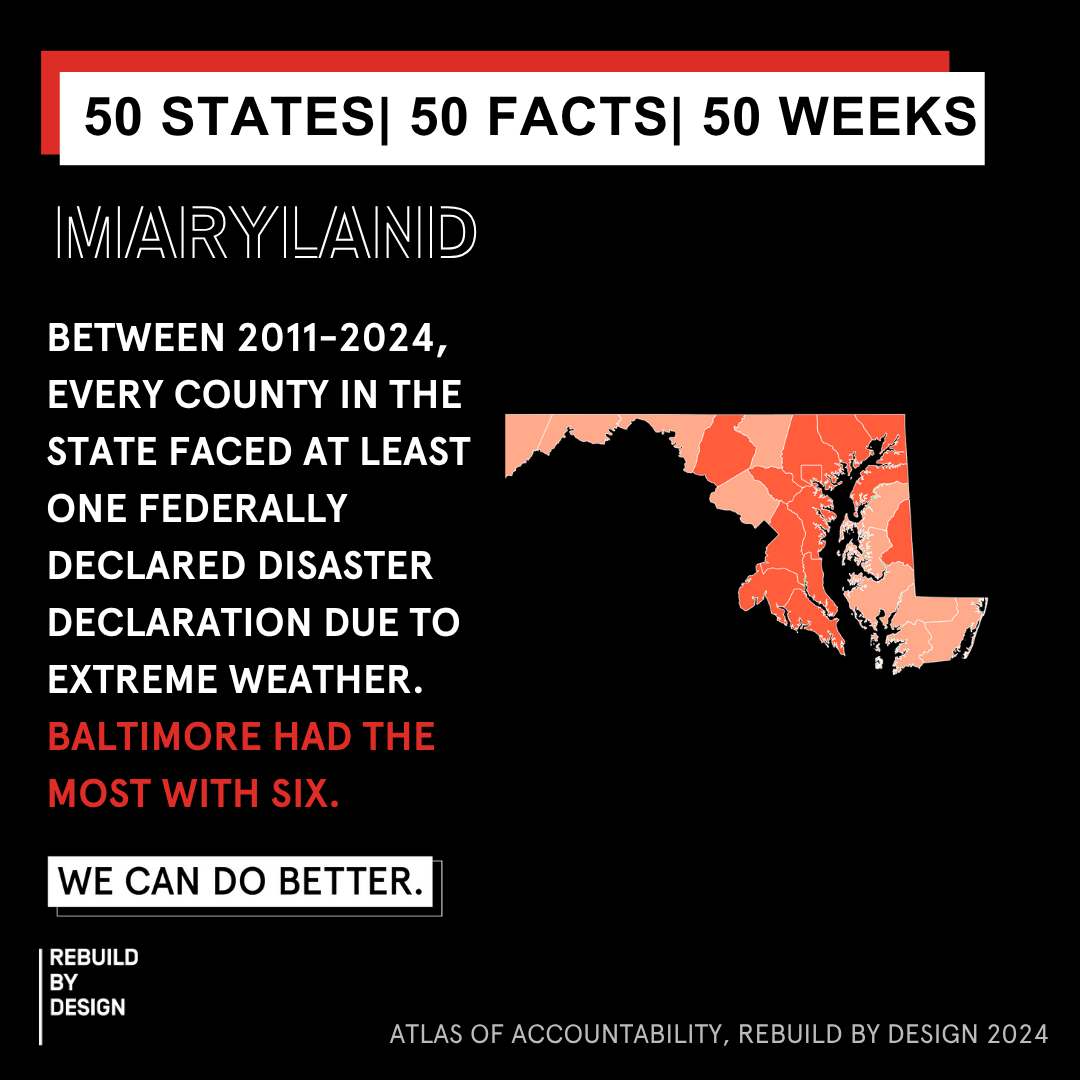 In 2024, Rebuild by Design launched the 50 States | 50 Facts | 50 Weeks social media campaign to bring national attention to the true scope of climate impacts in the United States. Each week, we shared data-driven graphics highlighting how every state has been affected by federally declared disasters—ranging from hurricanes to wildfires to extreme heat—and the billions in recovery costs paid by taxpayers.