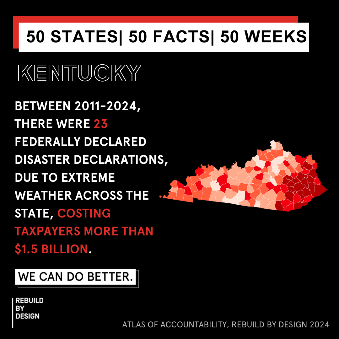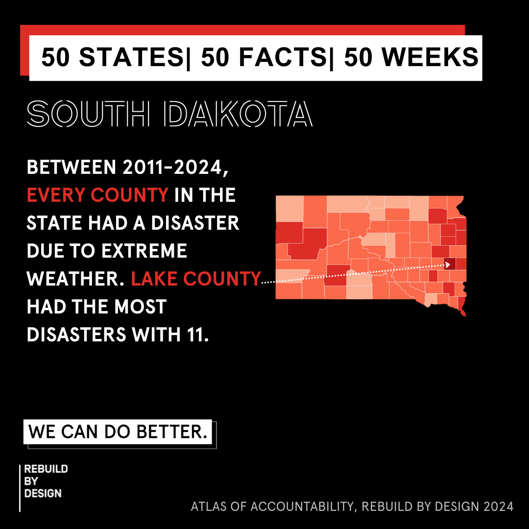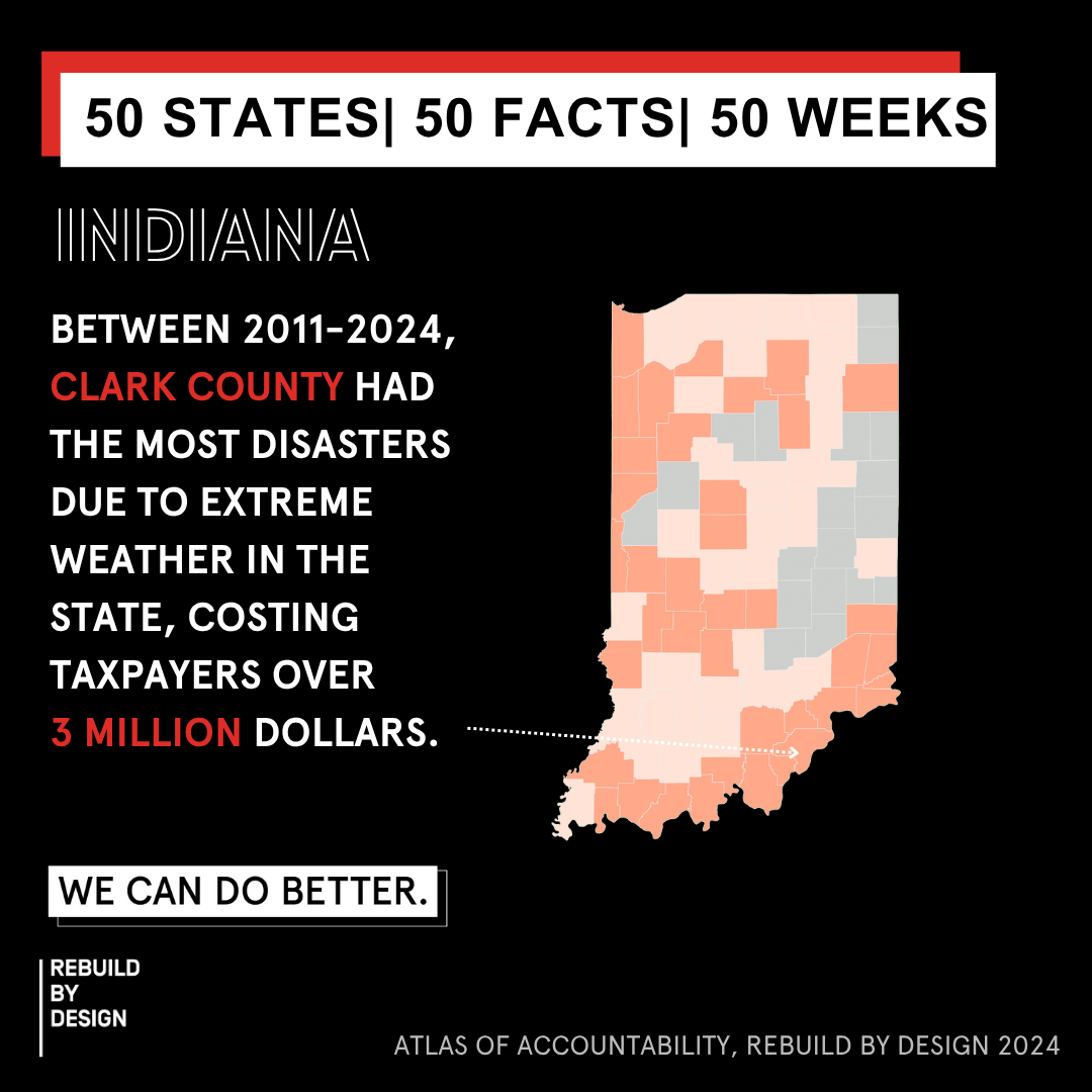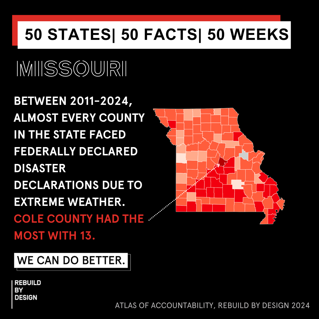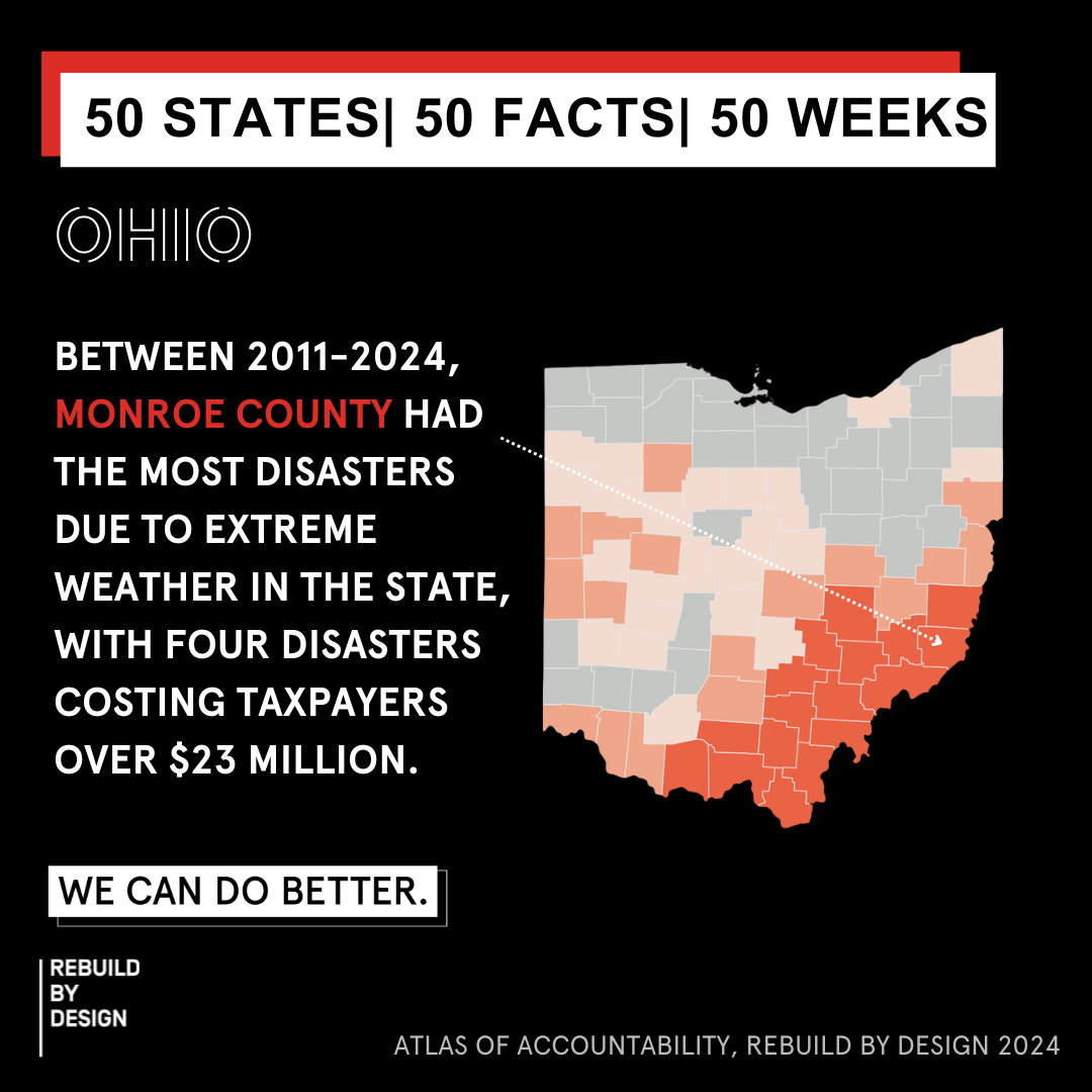 In 2024, Rebuild by Design launched the 50 States | 50 Facts | 50 Weeks social media campaign to bring national attention to the true scope of climate impacts in the United States. Each week, we shared data-driven graphics highlighting how every state has been affected by federally declared disasters—ranging from hurricanes to wildfires to extreme heat—and the billions in recovery costs paid by taxpayers.