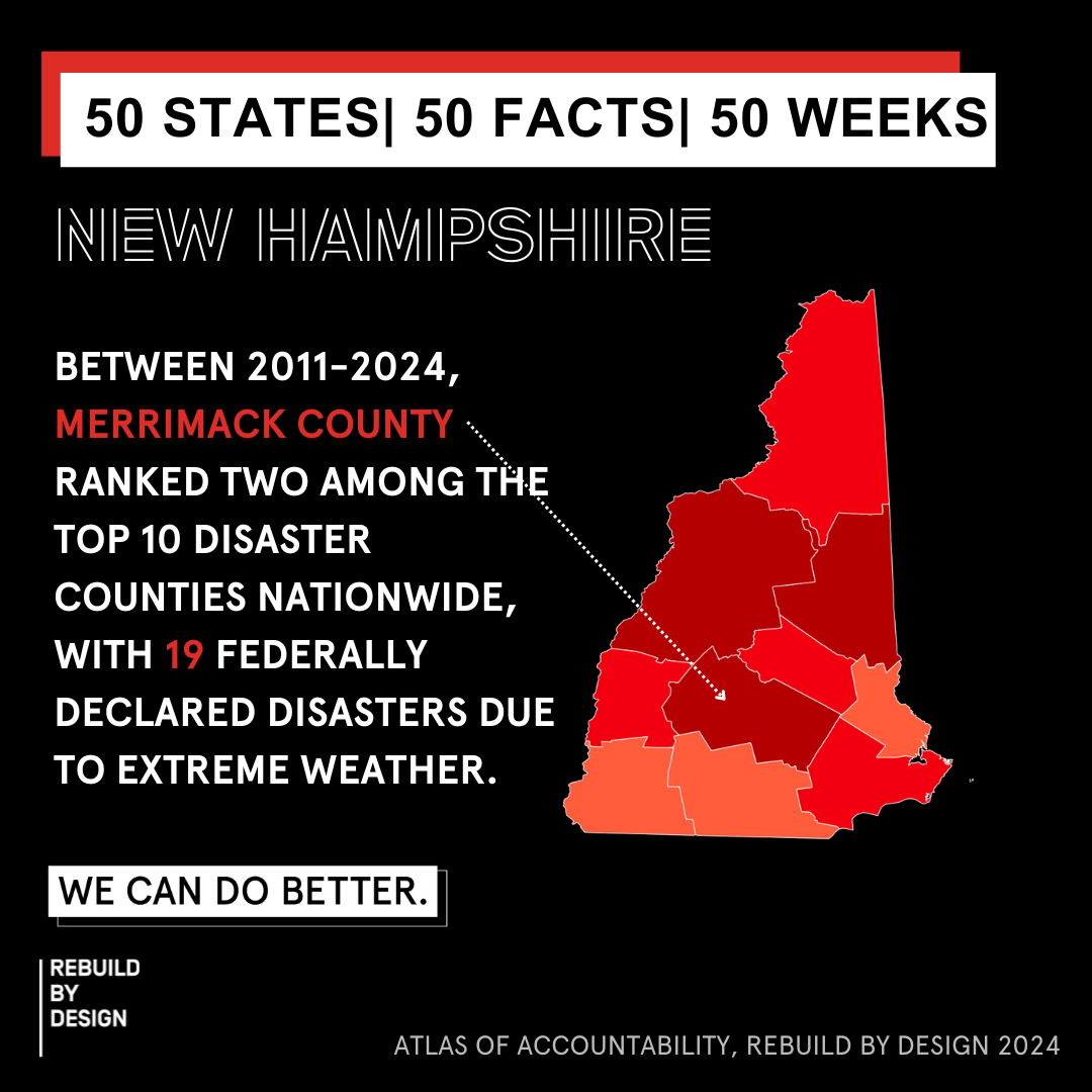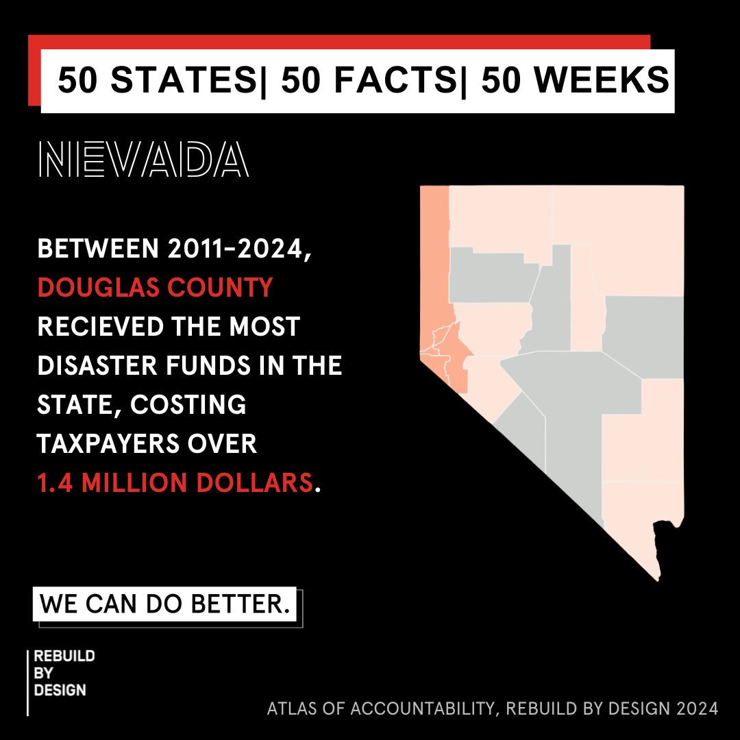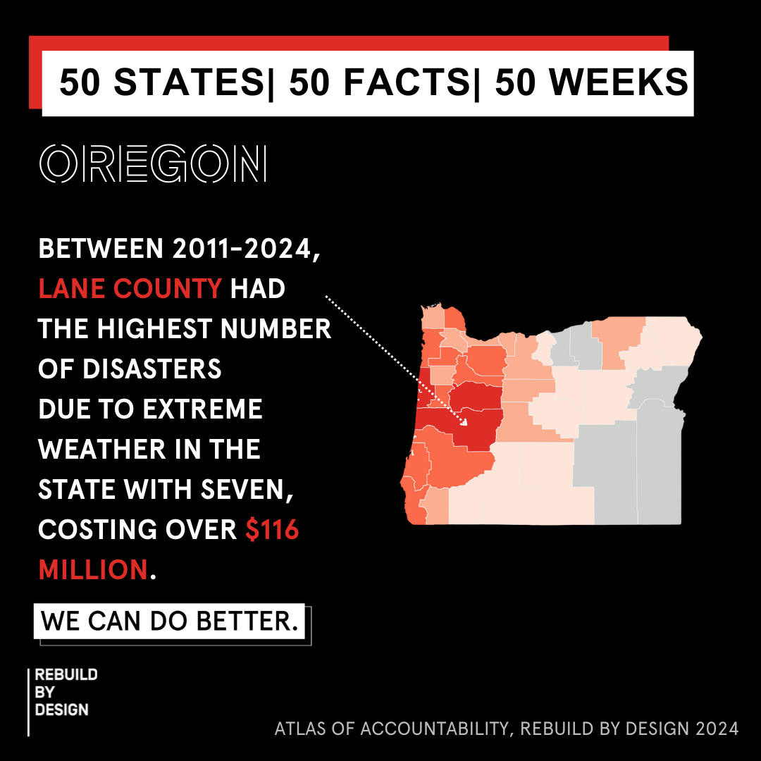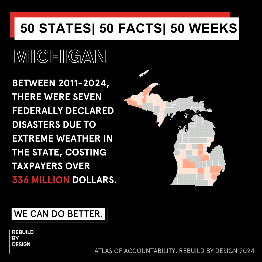 In 2024, Rebuild by Design launched the 50 States | 50 Facts | 50 Weeks social media campaign to bring national attention to the true scope of climate impacts in the United States. Each week, we shared data-driven graphics highlighting how every state has been affected by federally declared disasters—ranging from hurricanes to wildfires to extreme heat—and the billions in recovery costs paid by taxpayers.