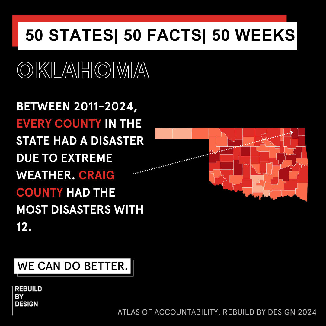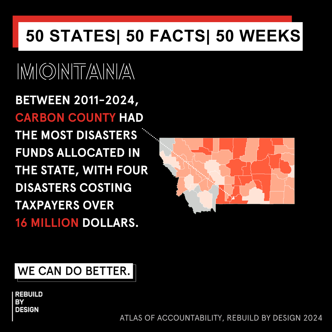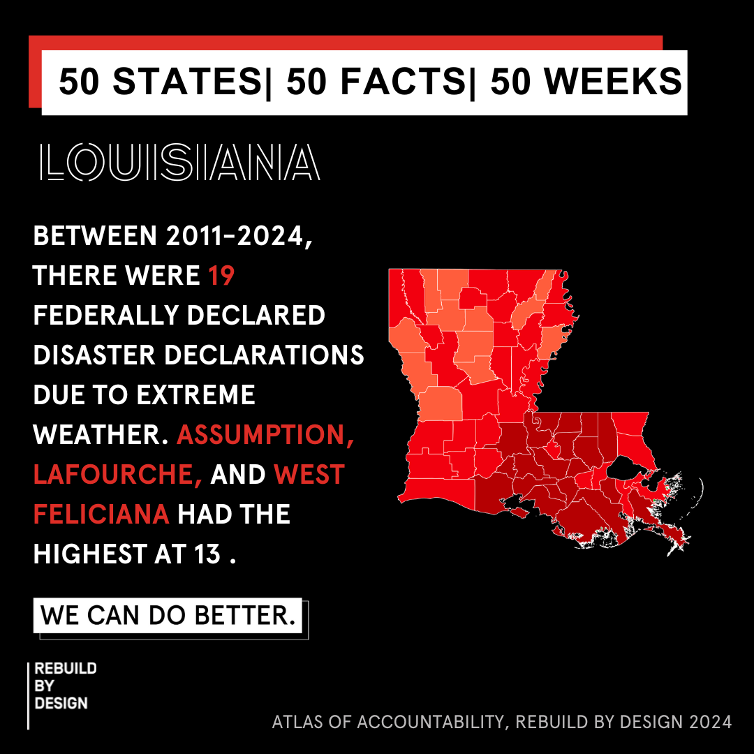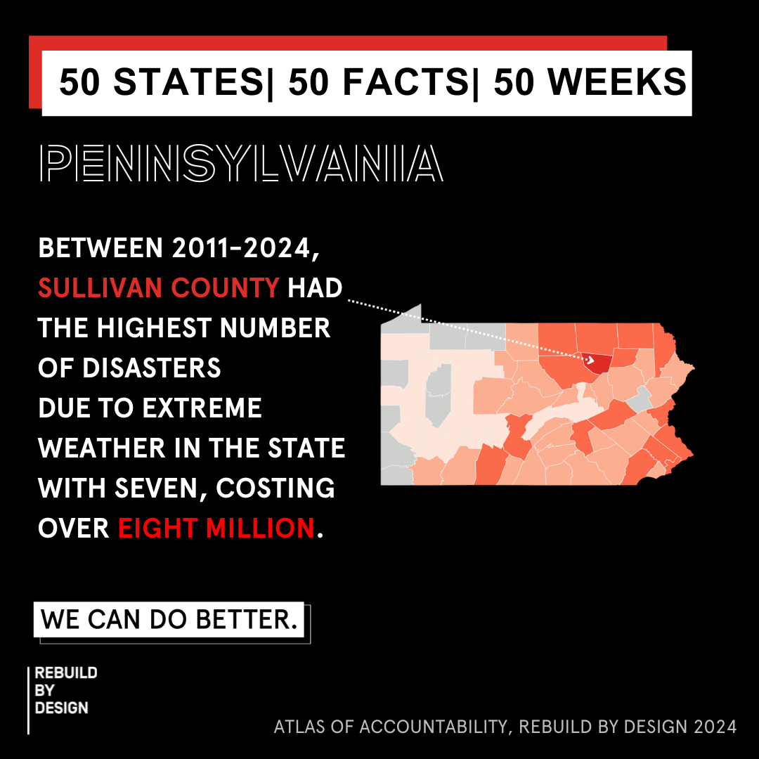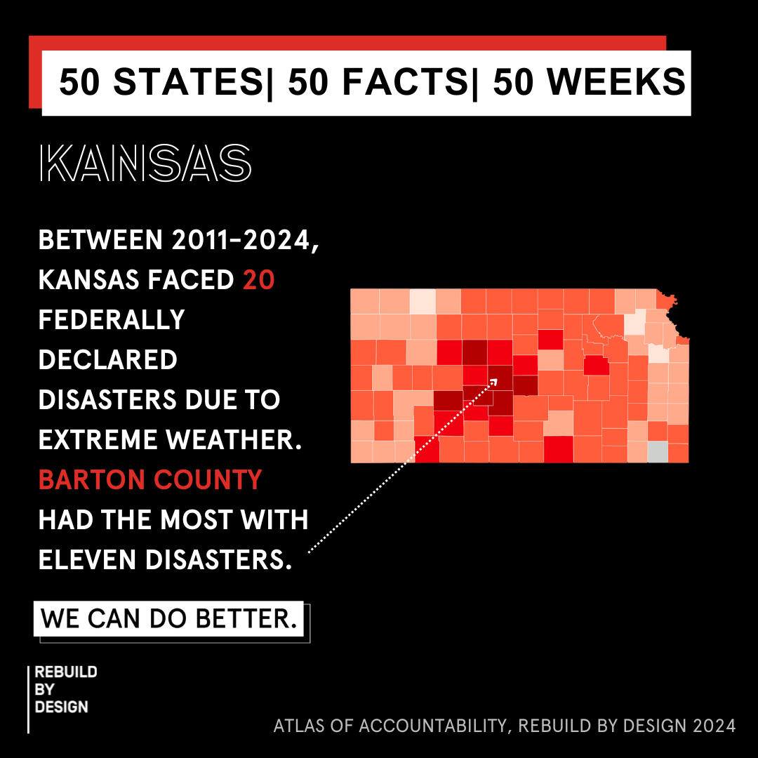 In 2024, Rebuild by Design launched the 50 States | 50 Facts | 50 Weeks social media campaign to bring national attention to the true scope of climate impacts in the United States. Each week, we shared data-driven graphics highlighting how every state has been affected by federally declared disasters—ranging from hurricanes to wildfires to extreme heat—and the billions in recovery costs paid by taxpayers.