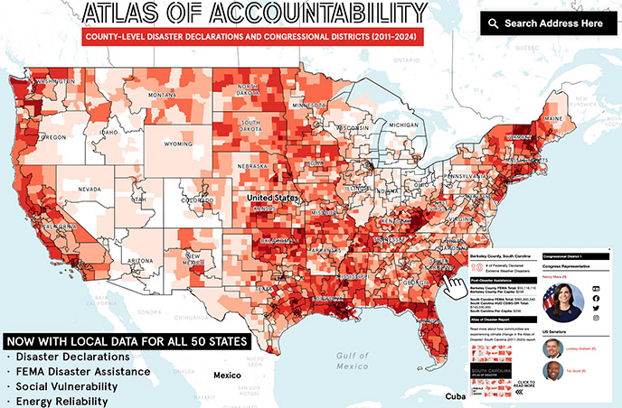 The Atlas of Accountability maps federal disaster declarations and post-disaster assistance obligations for every county in the U.S., with overlays by congressional district between 2011-2024. Explore the map >>
