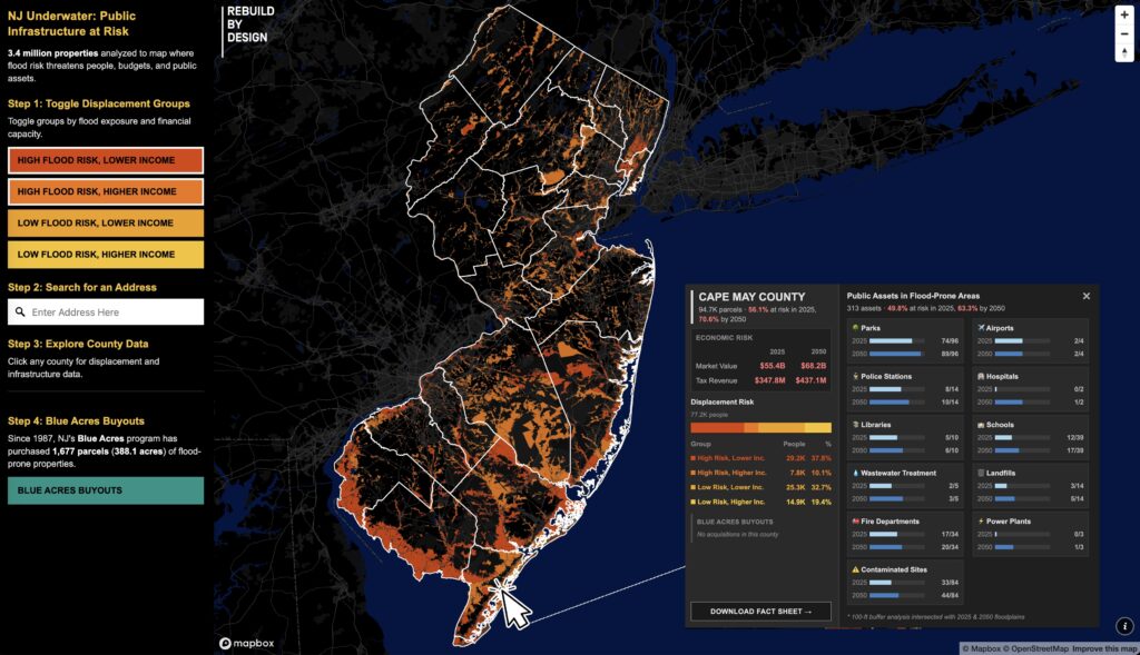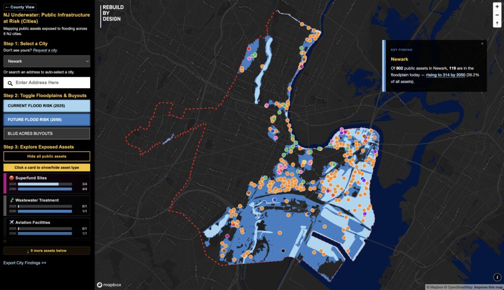 Rebuild’s latest research, “NJ Underwater: Public Infrastructure at Risk,” finds nearly 1 in 4 public facilities in New Jersey are currently at risk of flooding. By 2050, that rises to more than 1 in 3.