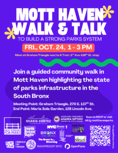 That’s why we’re co-hosting the Mott Haven Walk & Talk with South Bronx Unite, New Yorkers for Parks, and partners on October 24. Join us for a community walk through Mott Haven to see first-hand how investing in parks and the public realm could mitigate climate risks and create community benefits every day.
