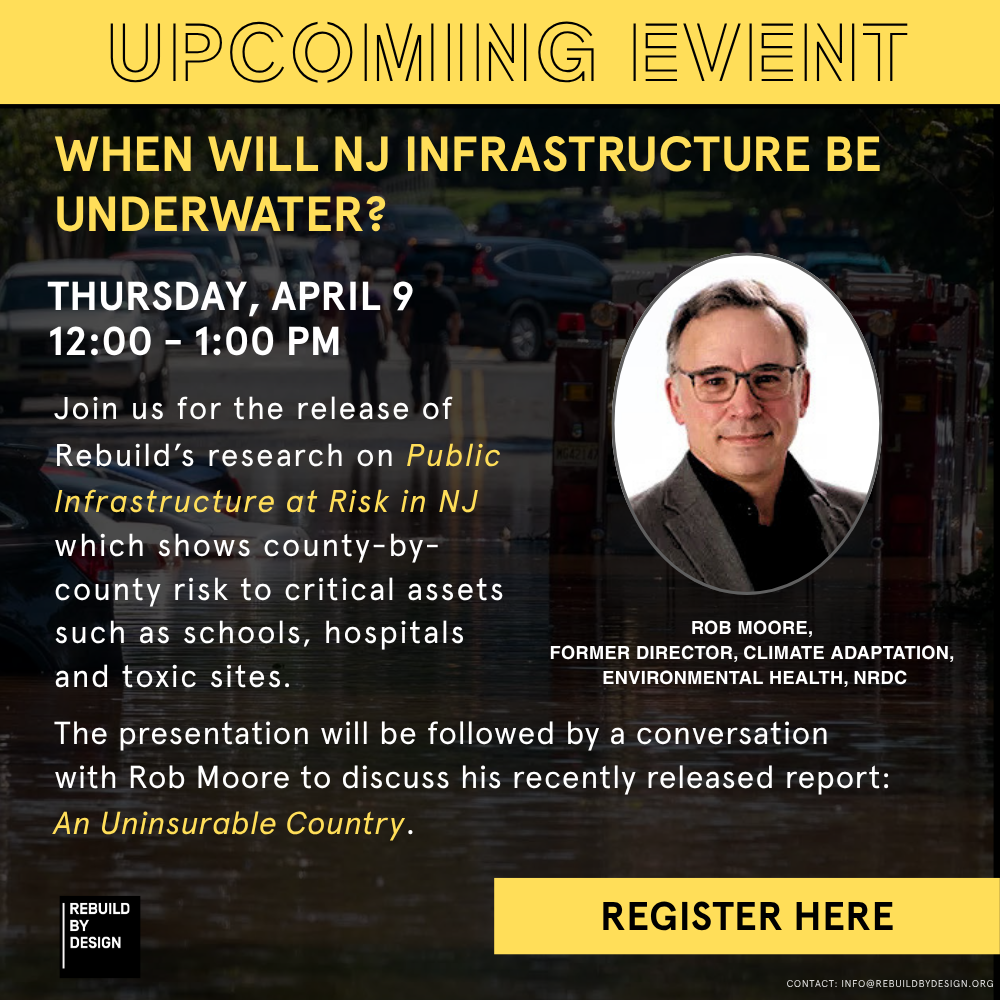 Join Rebuild by Design for our New Jersey event series, offering an in-depth look at the updated findings from the NJ Atlas of Disaster, along with insights from guest speakers who are leading efforts to address climate challenges in New Jersey. Sessions are free and open to all who are interested in climate resilience. Each session explores localized climate impacts in New Jersey, the economic and social costs of inaction, and the latest strategies for building a more resilient future. The series is designed to engage policymakers, community leaders, and the public in conversations about climate adaptation and infrastructure funding.