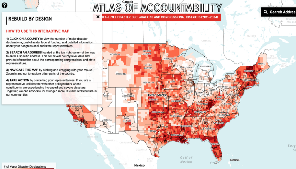 The Atlas of Accountability maps federal disaster declarations and post-disaster assistance obligations for every county in the U.S., with overlays by congressional district. It reveals where billions in taxpayer dollars have been spent and raises a critical question: How can we invest in long-term resilience, instead of paying for recovery again and again?