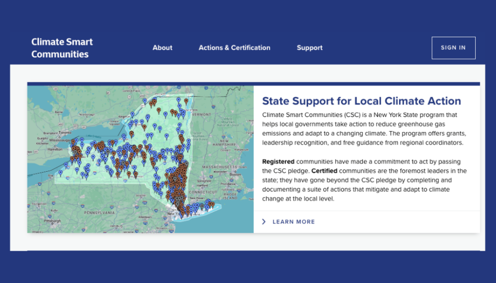 Climate Smart Communities (CSC) is a New York State program that helps local governments take action to reduce greenhouse gas emissions and adapt to a changing climate. The program offers grants, leadership recognition, and free guidance from regional coordinators.