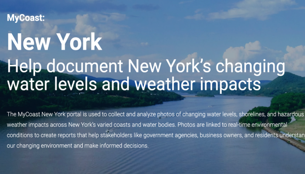 The MyCoast New York portal is used to collect and analyze photos of changing water levels, shorelines, and hazardous weather impacts across New York’s varied coasts and water bodies. Photos are linked to real-time environmental conditions to create reports that help stakeholders like government agencies, business owners, and residents understand our changing environment and make informed decisions.