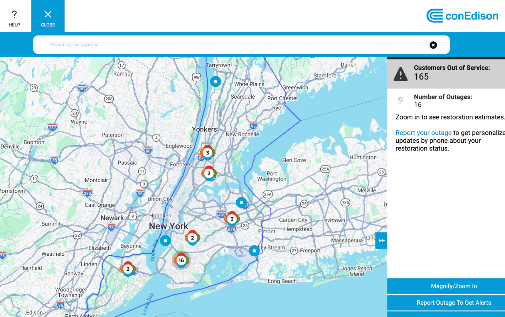 A map of current and ongoing energy outages among Con Edison customers around NYC. Updated every 15 to 30 minutes with the latest status of service disruptions and repair work.