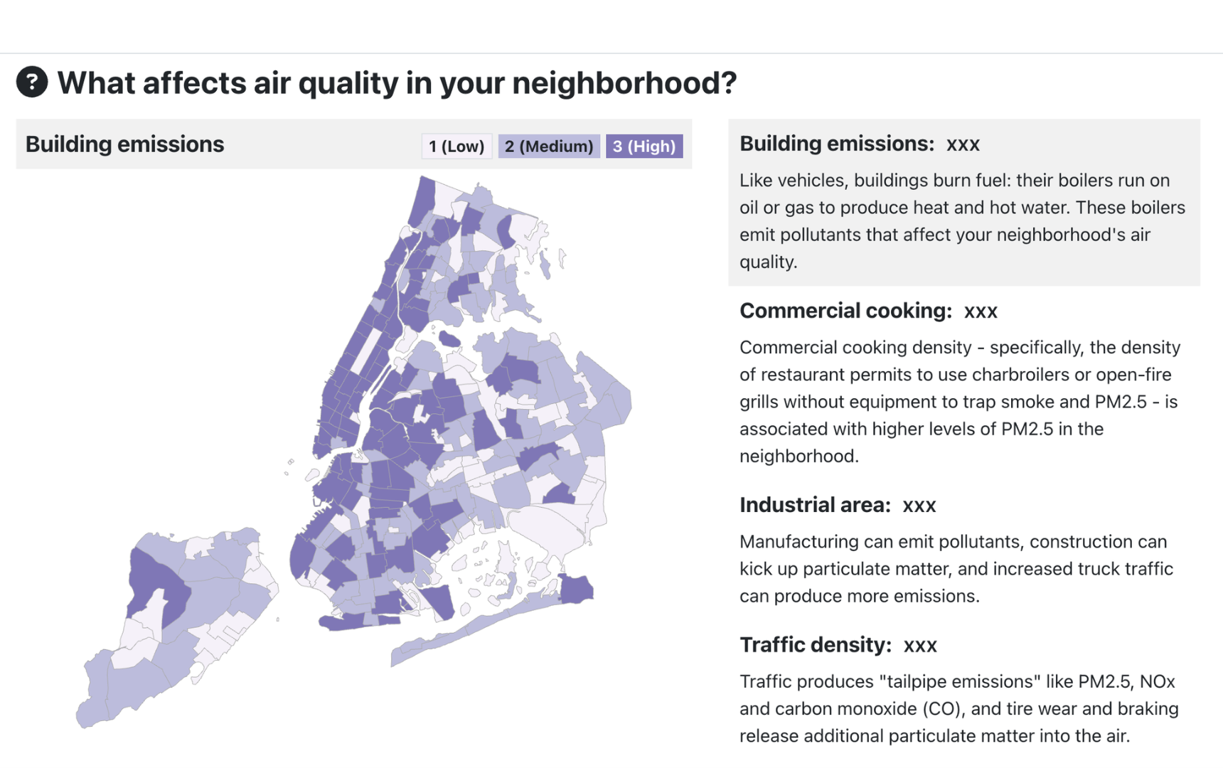 NYC combines data from our air quality monitoring network, NYCCAS, with other data to understand what makes air quality in one neighborhood different from air quality in another. We found that building emissions, building density, industrial areas, and traffic density are associated with differences in air quality.